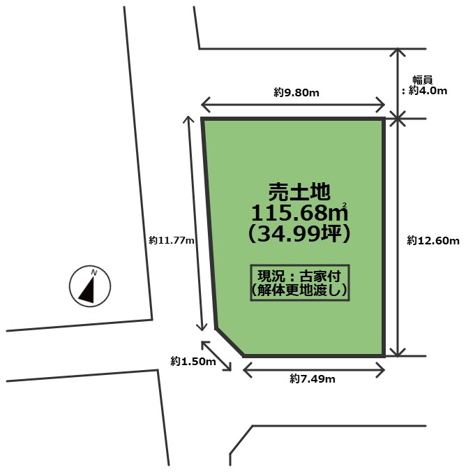 三方 (南東側 間口7.4m) (南西側 間口11.7m) (北西側 私道4.0m 間口9.8m) |